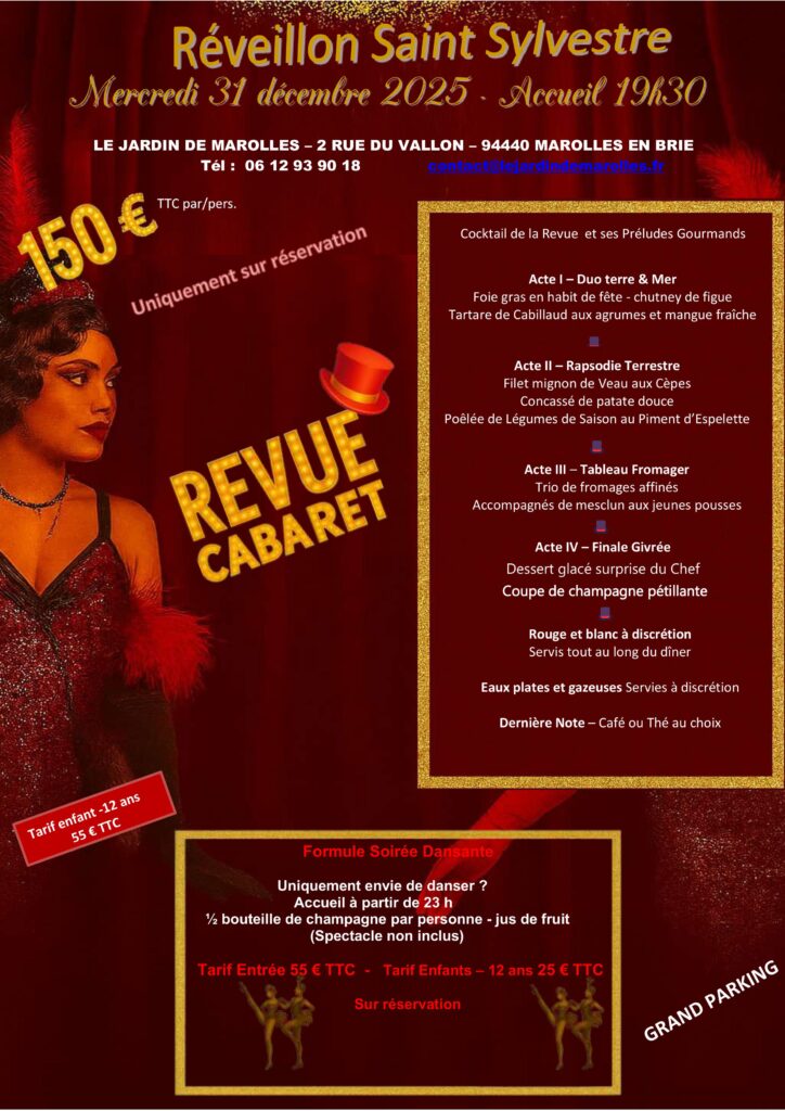 Pour célébrer la nouvelle année, Le Jardin de Marolles vous invite à une soirée d’exception placée sous le signe de la fête et de l’élégance ! Le mercredi 31 décembre 2025, à partir de 19H30, vivez un réveillon cabaret inoubliable dans une ambiance chaleureuse et festive.